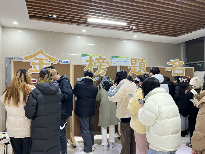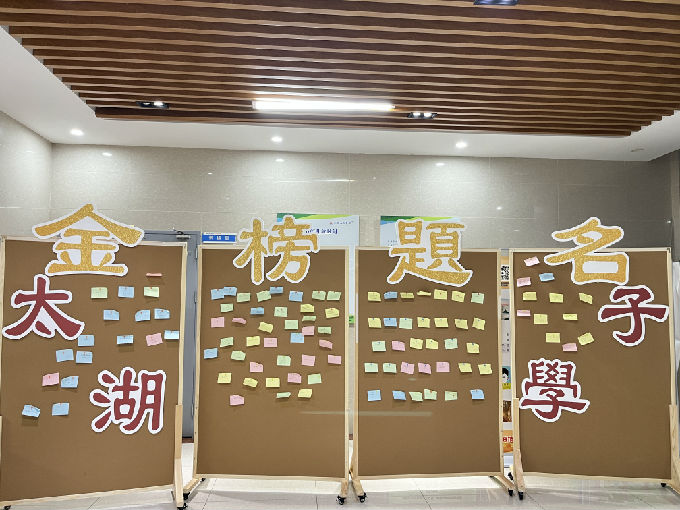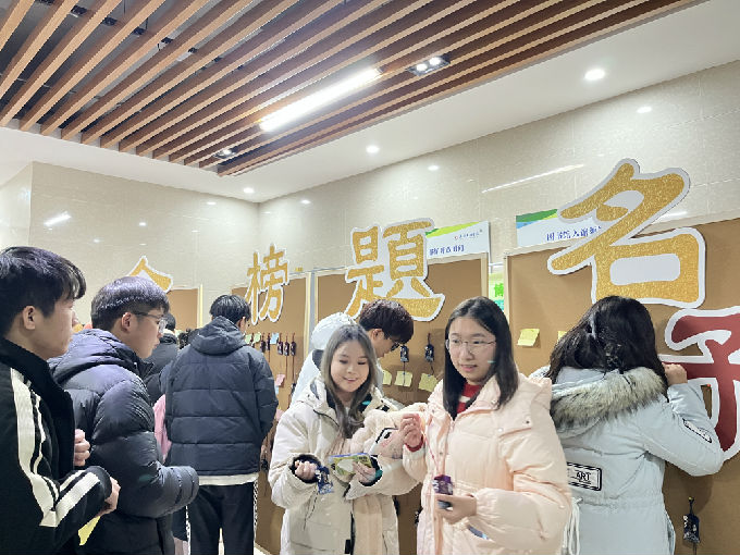 金榜题名墙位于图书馆B馆一楼,上面贴满了各种色彩斑斓的祝福语,有的写着“金榜题名”,有的写着“万事顺利”,还有的写着“你是最棒的”,每一句祝福语都充满了他们彼此的深深祝福和鼓励。