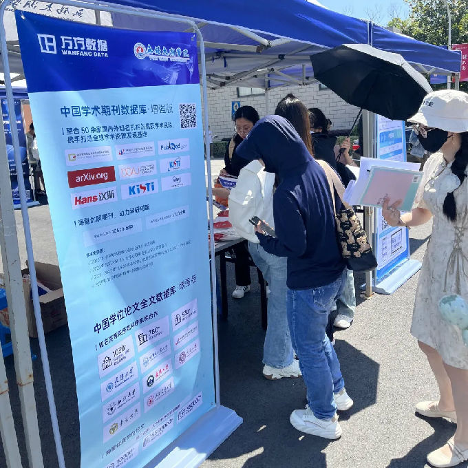 活动现场,来自知网的工作人员展示了其庞大的学术资料库,包括期刊、学位论文和会议论文等。万方数据的工作人员则重点介绍了其特色数据库。