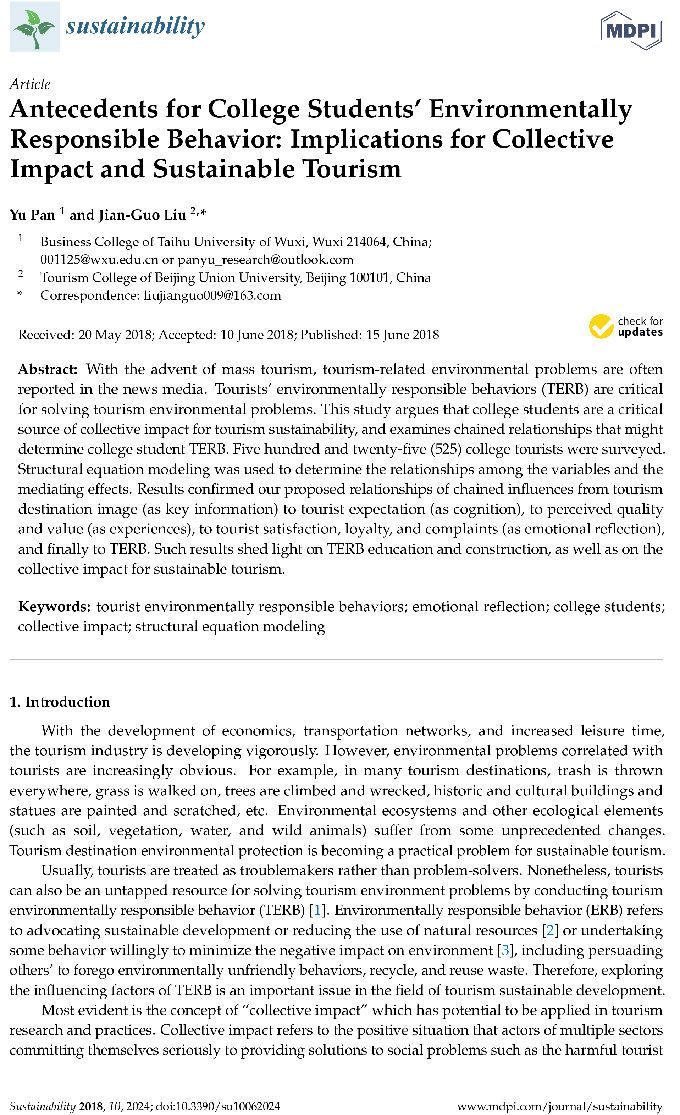 本网讯 近日,从商学院传来喜讯,我校商学院旅游系青年教师潘禹撰写的《Antecedents for College Students’ Environmentally Responsible Behavior:Implications for Collective Impact and Sustainable Tourism》在期刊《Sustainability》上发表,《Sustainability》为社会科学引文索引(SSCI)和科学引文索引(SCI)数据库共同收录期刊,在ENVIRONMENTAL STUDIES(环境研究)和GREEN & SUSTAINABLE SCIENCE & TECHNOLOGY(绿色和可持续科学与技术)两类中的JCR分区分别为Q2和Q3,2016年影响因子1.789,该期刊是环境、经济和人类可持续发展方面的跨学科专业性期刊。